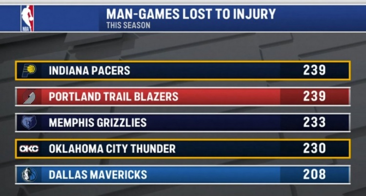 星空体育公司-本赛季伤缺人次:步行者&开拓者239次并列第一 熊&雷&侠三到五